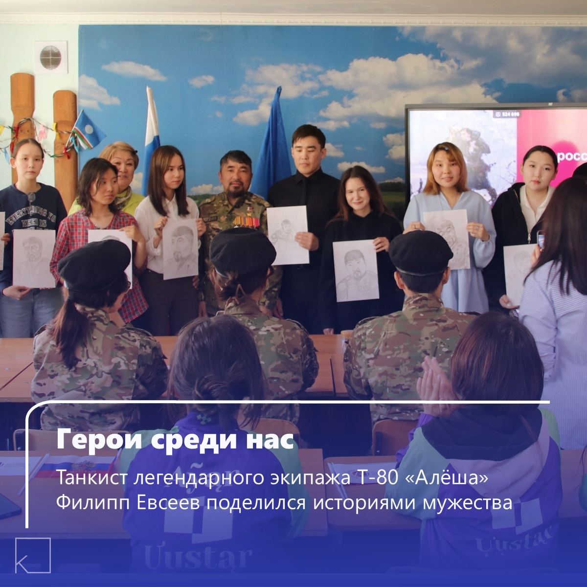 Герой России Филипп Евсеев встретился со студентами колледжа «Айар Уустар» в рамках акции «Портрет героя». Танкист легендарного экипажа Т-80 «Алёша» поделился историями мужества, а учащиеся создали его портреты и вручили памятные подарки.